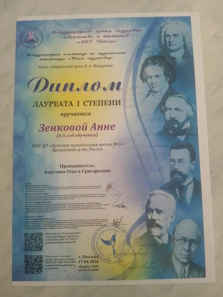 Зенкова Анна, 6 класс, стала победителем Международной олимпиады по музыкальной литературе "Юный музыковед", посвященной творчеству В.А.Моцарта. Поздравляем Анну и ее преподавателя Березину Ольгу Григорьевну 🏆🏆🏆