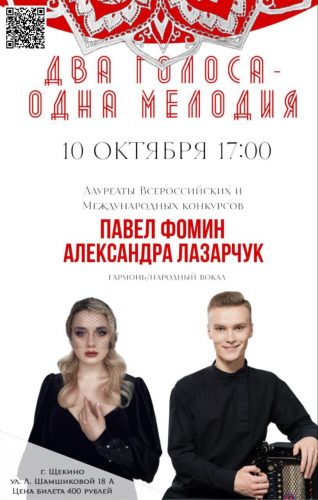 10 октября в 17:00 на сцене ЩДМШ №1 им. Л.Н. Толстого выступят виртуозный гармонист Павел Фомин и очаровательная вокалистка Александра Лазарчук.