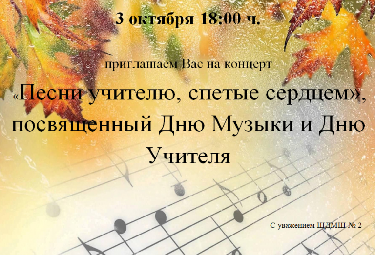 3 октября в ЩДМШ 2 состоялся концерт, посвященный двум чудесным праздникам: Международному Дню музыки и Дню учителя. Учащиеся фортепианного, струнно-смычкового, народного и вокального отделений поздравили своих учителей яркими выступлениями. Звучали частушки и песни в исполнении фольклорного ансамбля «Таусень». Провела концерт Сальникова Марина Анатольевна. Мероприятие прошло в дружественной, праздничной атмосфере. Каждый номер встречался громкими аплодисментами.