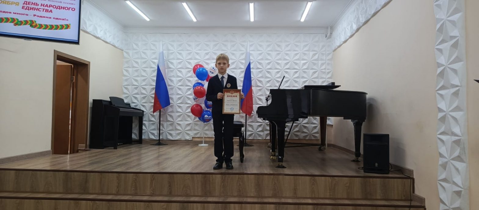 1 ноября 2025 г. в ДШИ рабочего поселка Первомайский прошло мероприятие, посвященное празднованию Дню народного единства: Фестиваль ЩМО «Краски осени». В программе фестиваля были представлены обработки русских народных песен в исполнении различных инструментов и вокалистов. От нашей школы принял участие Хорошилов Ярослав, учащийся 4 класса (кл.преподавателя Черкасовой В.Л.).